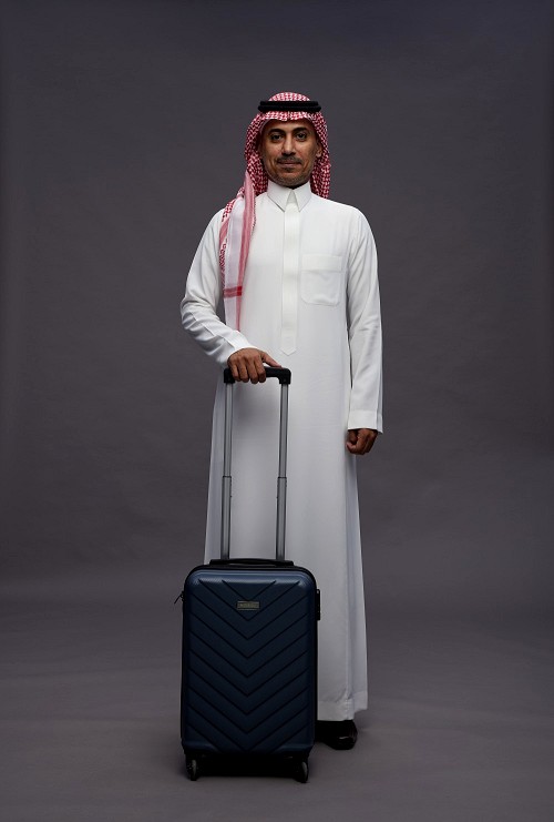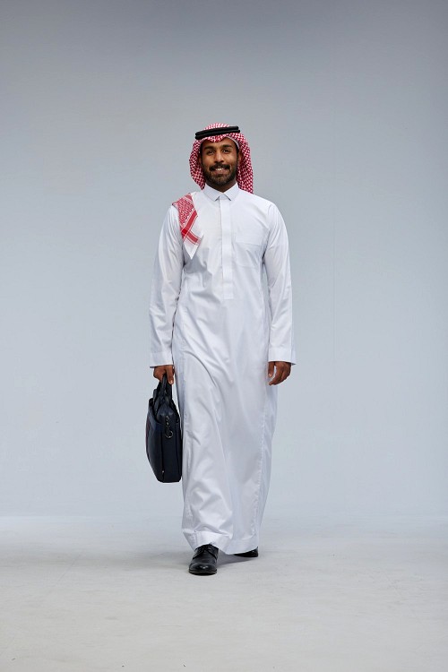 Saudi man Wearing Thob and shomag standing holding bag on Gray background