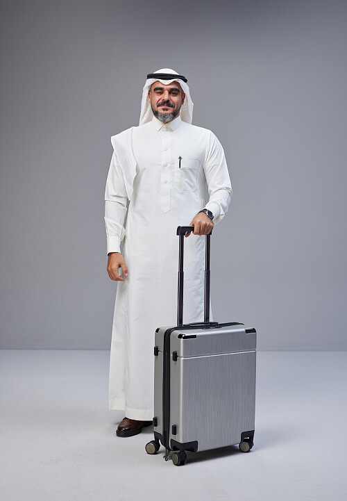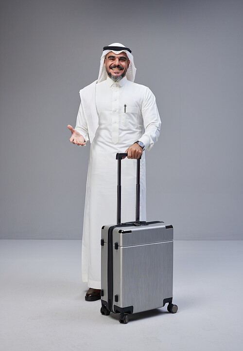 Saudi man wearing Thob and white Shomag standing holding Travel bag on Gray background