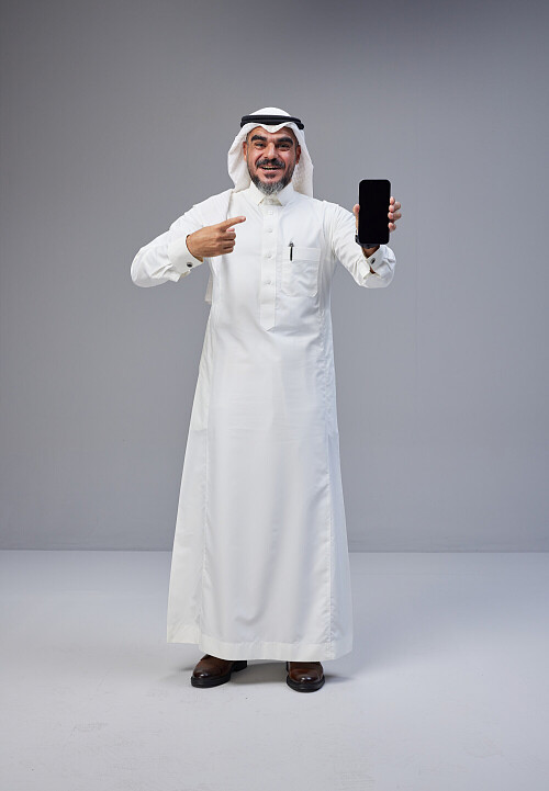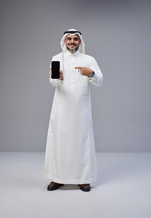Saudi man Wearing Thob and white Shomag standing showing phone to camera on Gray background