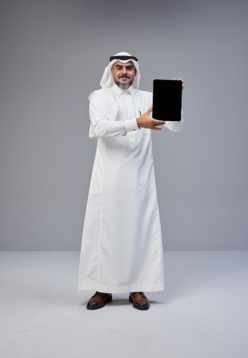 Saudi man Wearing Thob and white Shomag standing showing tablet to camera on Gray background