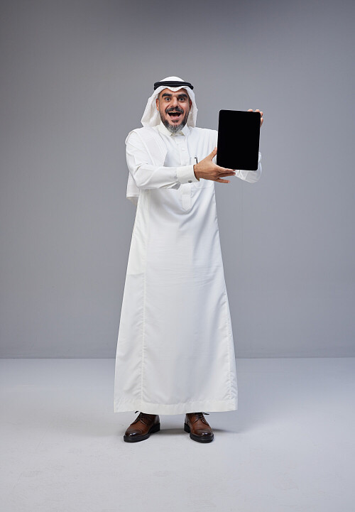 Saudi man Wearing Thob and white Shomag standing showing tablet to camera on Gray background