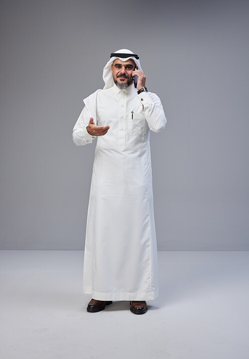 Saudi man Wearing Thob and white Shomag standing talking on phone on Gray background