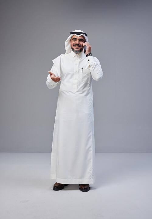 Saudi man Wearing Thob and white Shomag standing talking on phone on Gray background