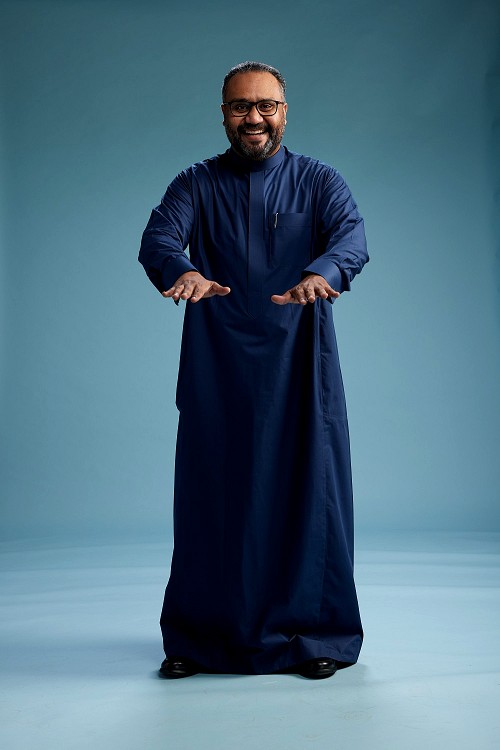 Saudi Man without shimag Standing Interacting with the camera on blue background