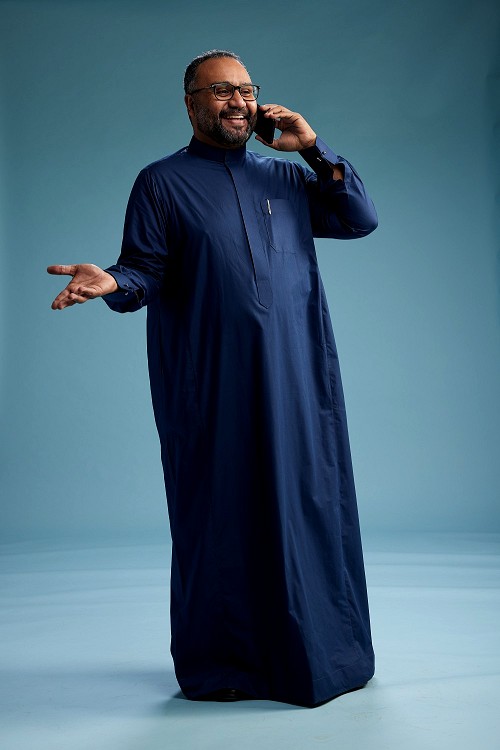Saudi Man without shimag Standing talking on phone on blue background