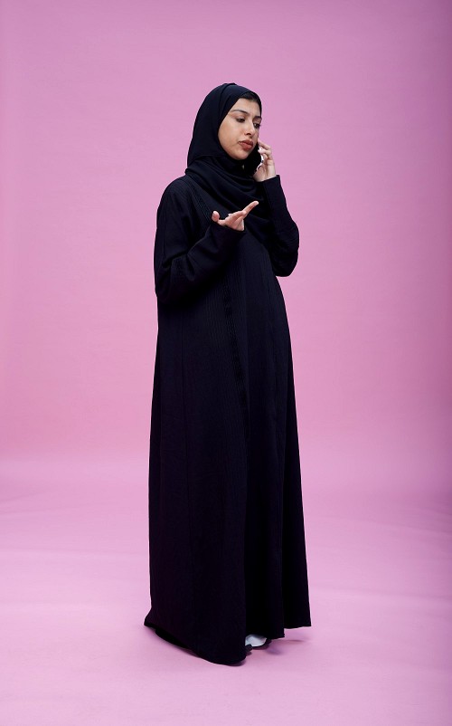 Saudi woman wearing Abaya standing talking on phone on pink background