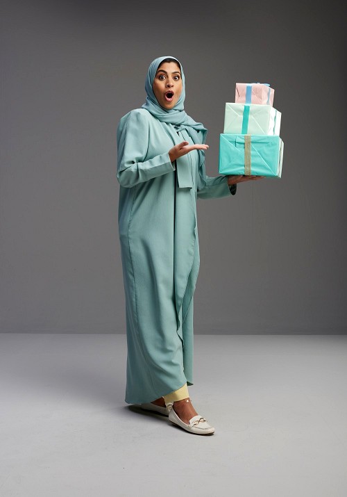 Saudi Woman wearing Abaya standing holding gift box on Gray background