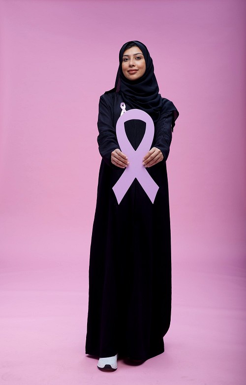 Saudi woman wearing pink ribbon on abaya standing holding awareness ribbon on plain pink background