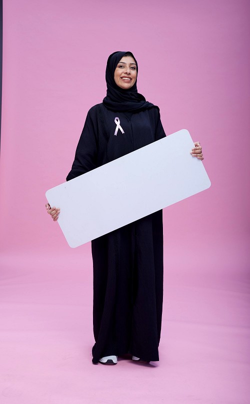 Saudi woman wearing pink ribbon on Abaya standing holding board on pink background