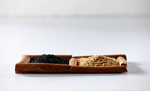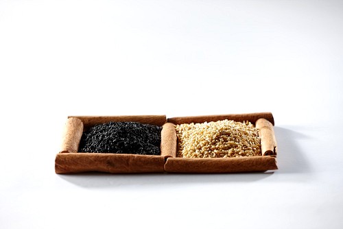 2 squares of cinnamon sticks full of sesame and black seeds on white flooring