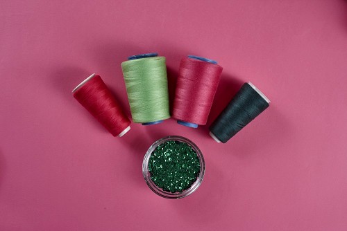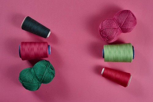 A grey collection of sewing and tailoring tools arranged on a pink background