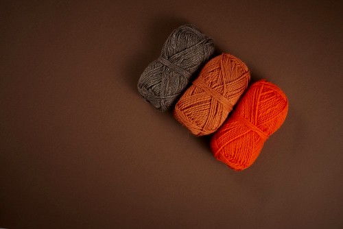 An orange collection of sewing and tailoring tools arranged on a brown background