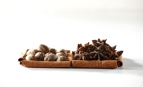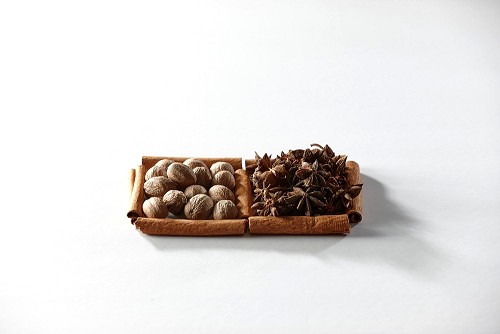 2 squares of cinnamon sticks full of star anise and nutmeg on white flooring