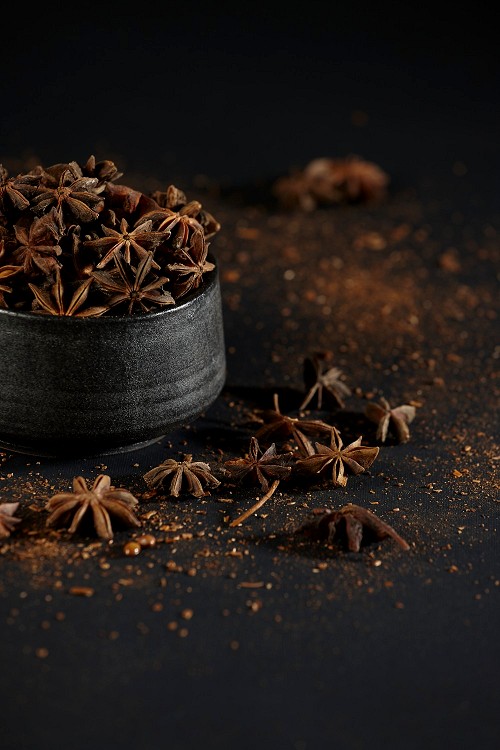 Star Anise in a black bowl with sprinkled anise on black flooring