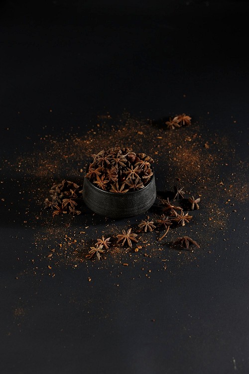 Star Anise in a black bowl with sprinkled anise on black flooring
