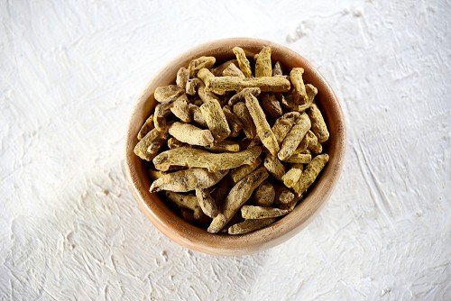 A wooden bowl full of dried turmeric whole fingers on a textured white flooring