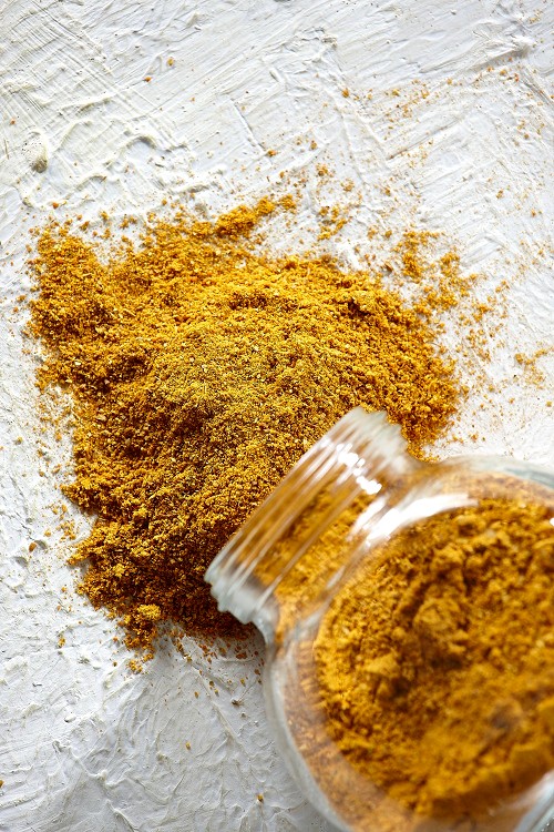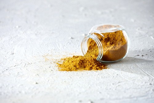A flipped glass spice jar full of turmeric powder and powder fell out it on textured white flooring