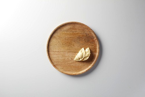 Two Sambosas on a wooden round plate on a white background