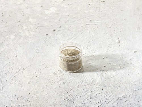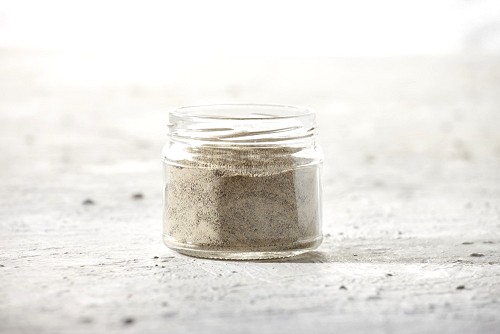 A glass jar full of white pepper powder on textured white flooring