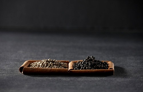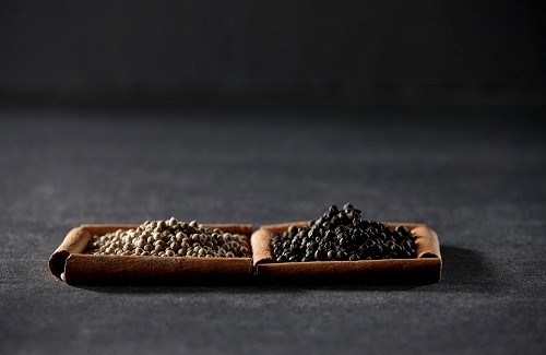2 squares of cinnamon sticks full of white peppers and black peppers on black flooring