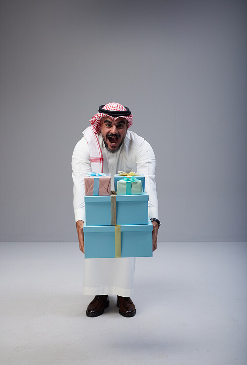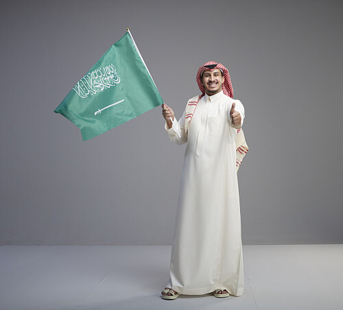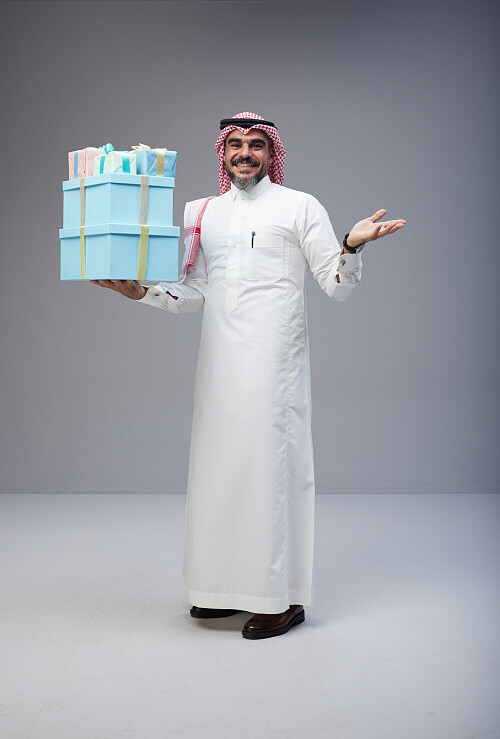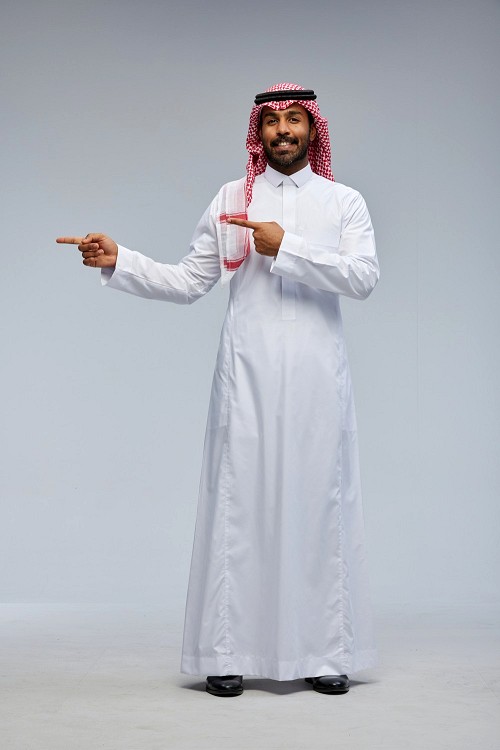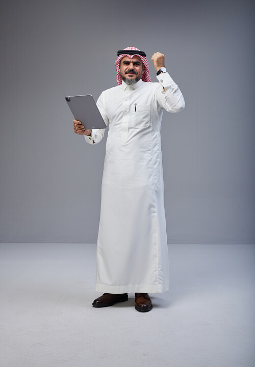A Saudi man Holding a Laptop on Blue Background wearing Saudi Thob and Shomag